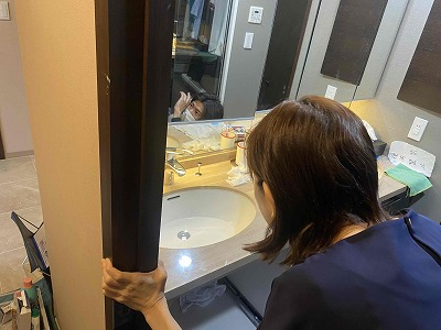 2人がかりで新しい洗面ボウルを設置します。