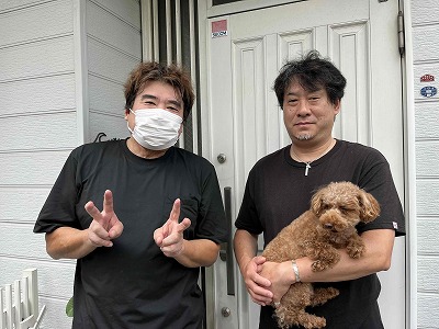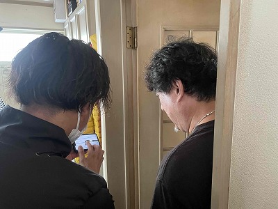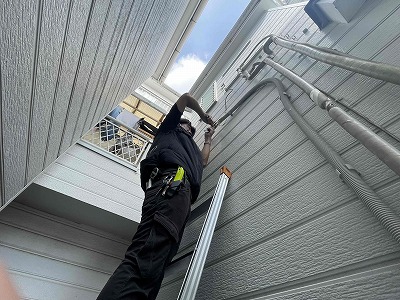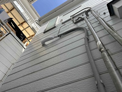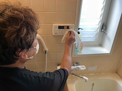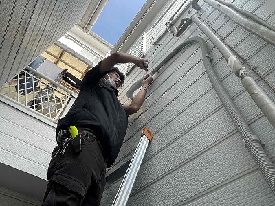 聖太は外で脚立に乗って追い炊き配管の接続部分を外して