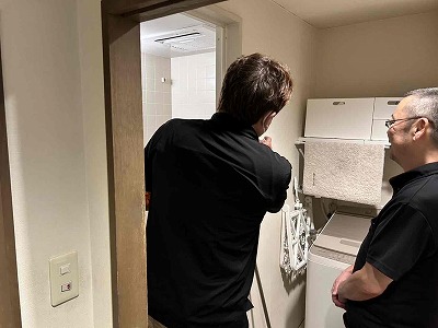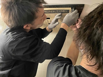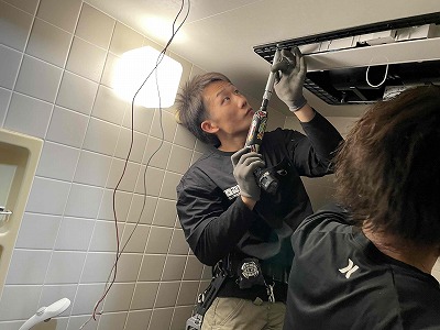 聖太と2人で新しい浴室乾燥暖房機本体を設置します。