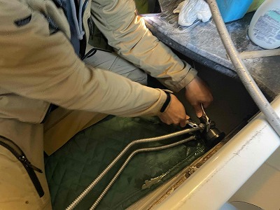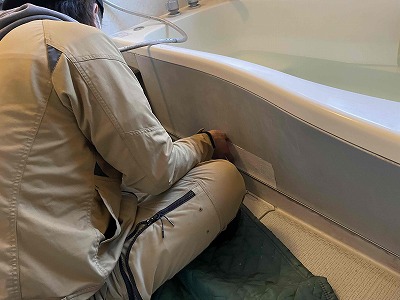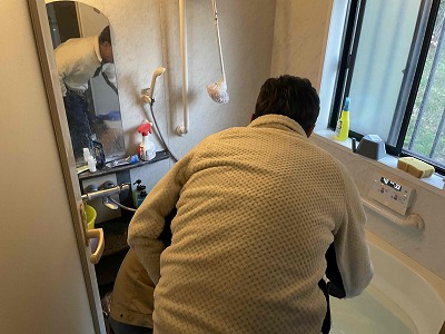 聖太は新しい循環金具に追い炊き配管を接続しています。