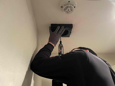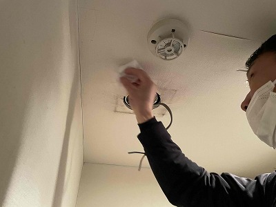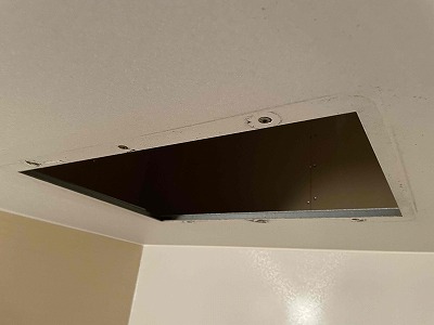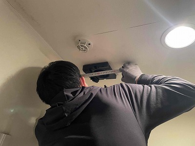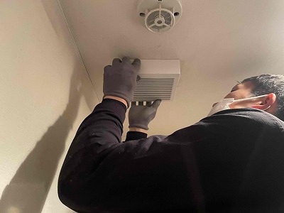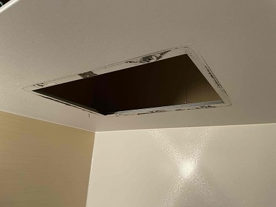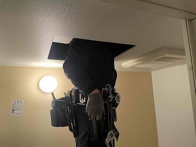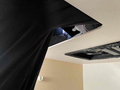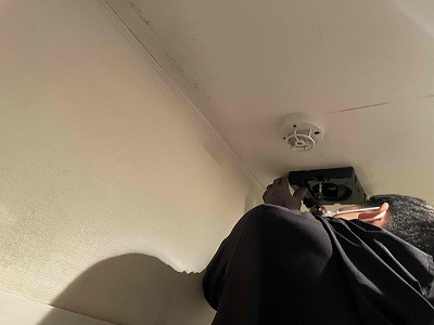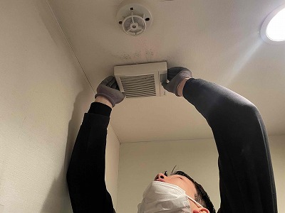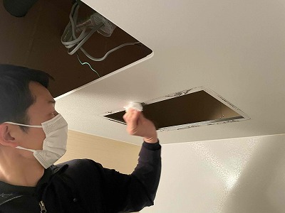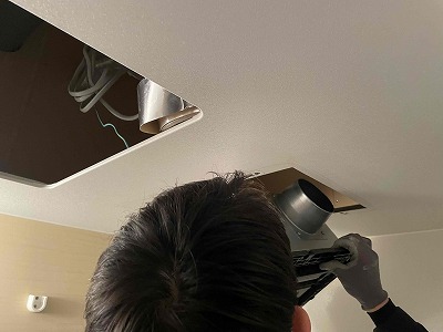 友哉くんに点検口から天井内で排気ダクトを外して