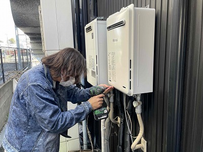 下準備が終わったら新しい給湯器本体を設置します。