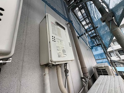 足場を持ちながら給湯専用器を持っていきます。