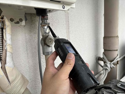 ガス漏れ確認は専用の検知器で確認します。